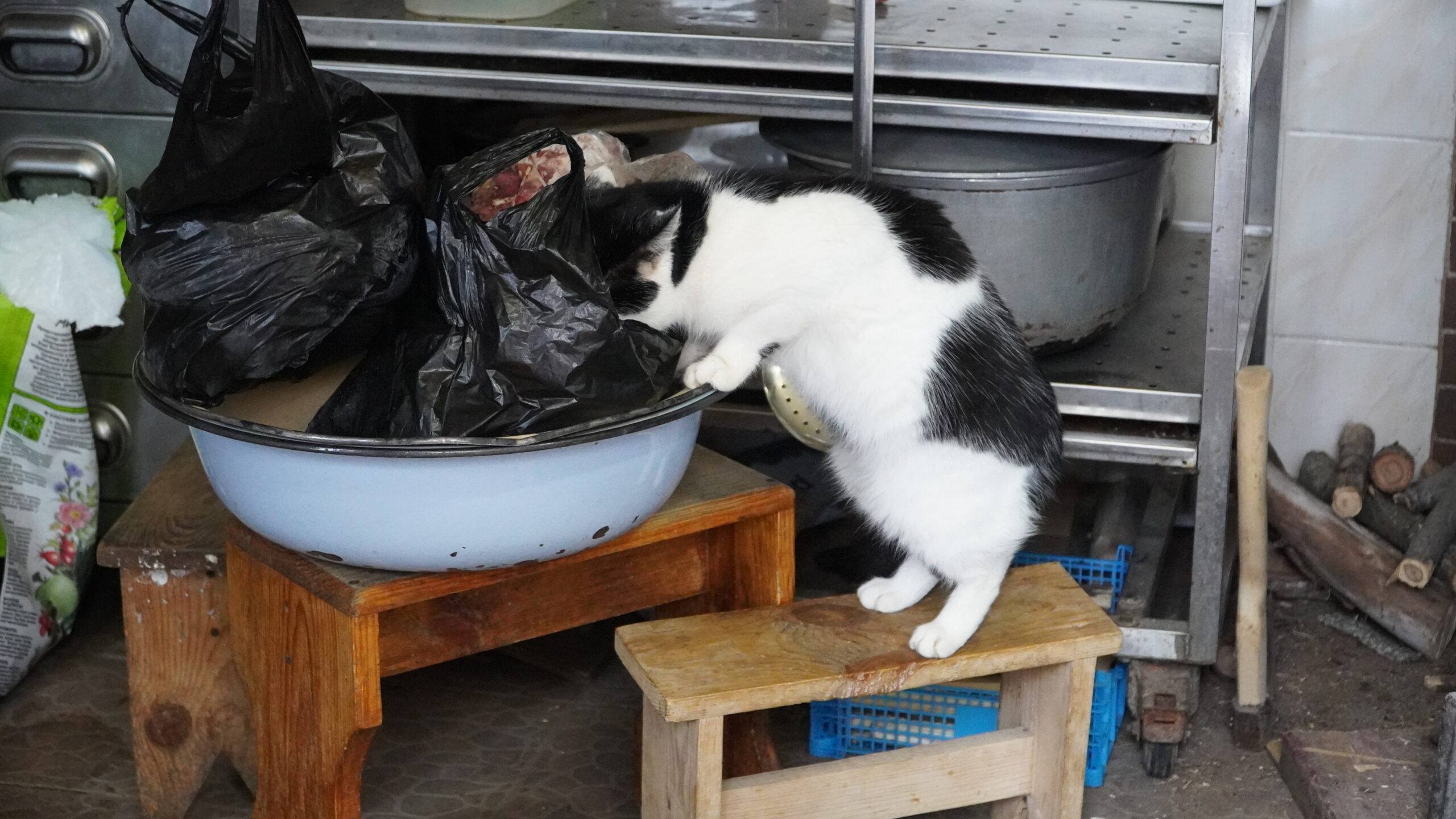 Вот, на кухне для животных, чёрно-белый пушистик проверяет качество мяса для каши. Чтобы прокормить такое большое количество четвероногих приходится варить очень много каши. Готовка начинается в 4-5 утра.