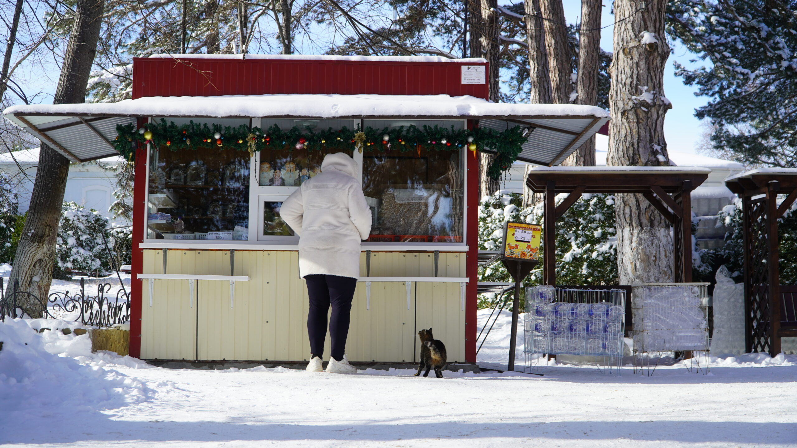 Ещё несколько кошек облюбовали церковную лавку. В летний период, когда туристов особенно много, четвероногие толпятся возле неё, чтобы заполучить у людей какое-нибудь лакомство.