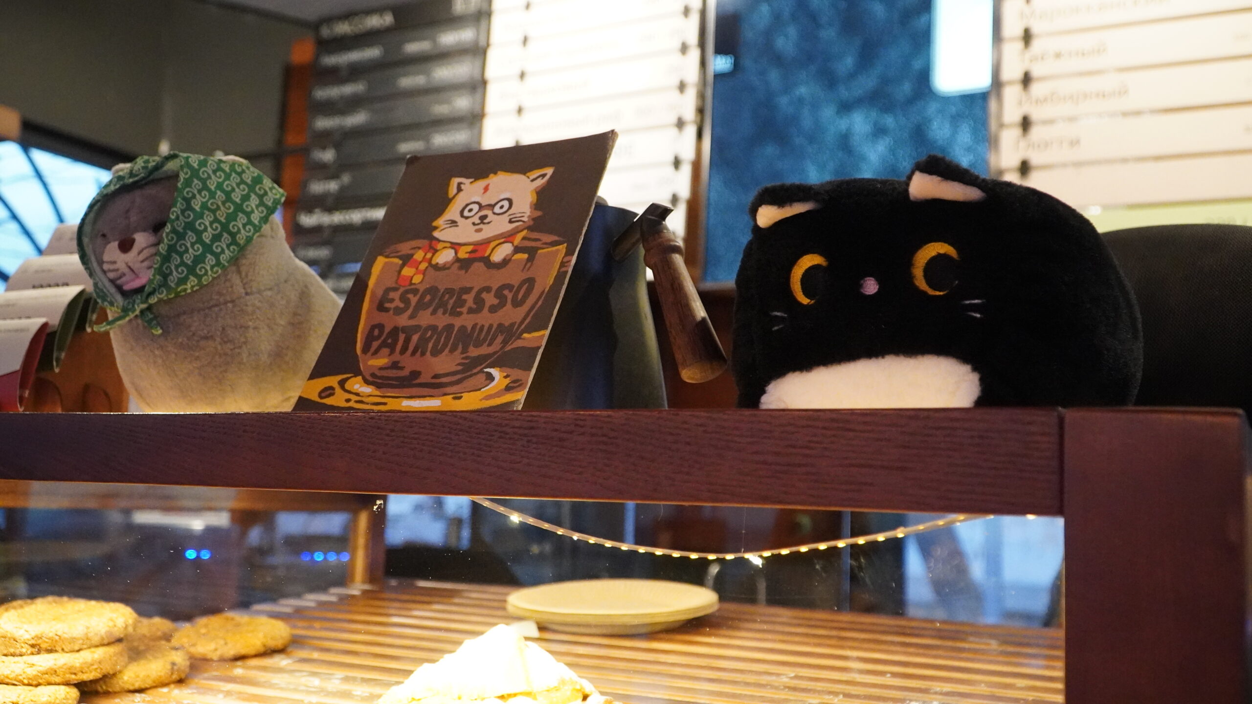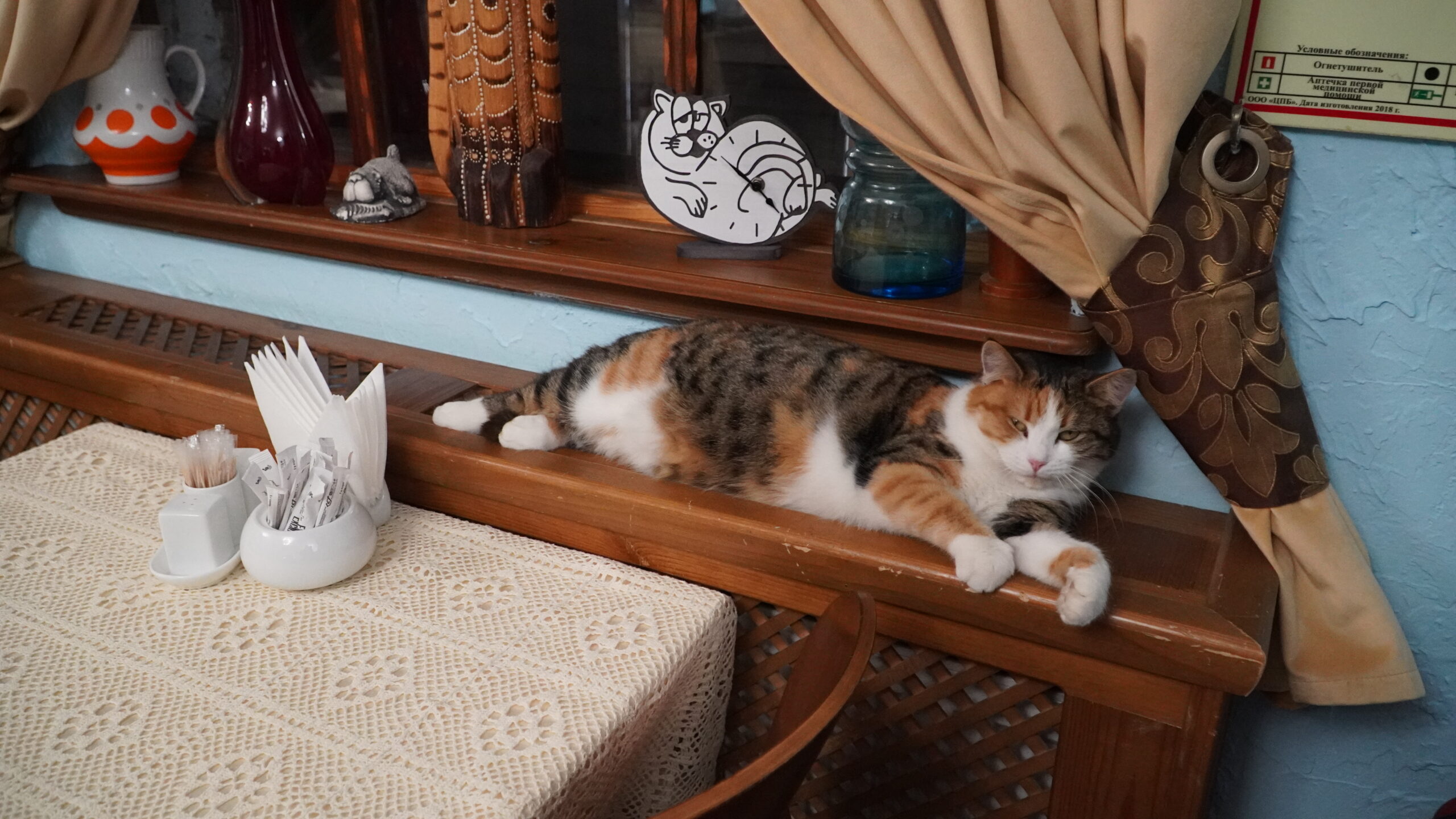 Главный талисман этого места – трёхцветная кошка по кличке Кисюлина. Любимые занятия этой красотки – сон на тёплой батарее и наблюдение за посетителями. Её мурлыканье всегда сопровождает музыку, которая доносится из ретро-проигрывателя в кафе.